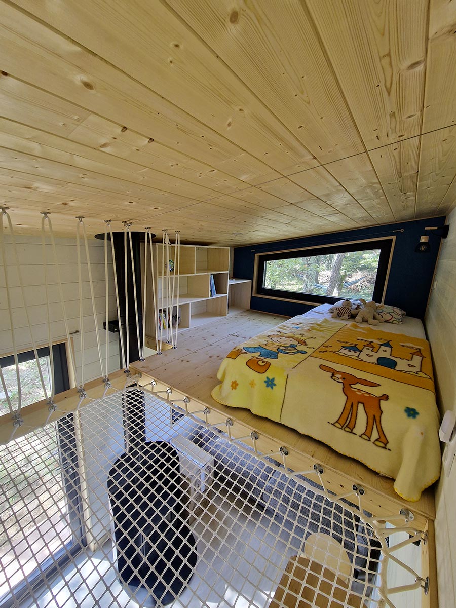 L’escalier a la possibilité de glisser sous la mezzanine et sous chacune de ses marches se cache un rangement. Une deuxième mezzanine habillée d’une verrière permet de crée un autre espace nuit.