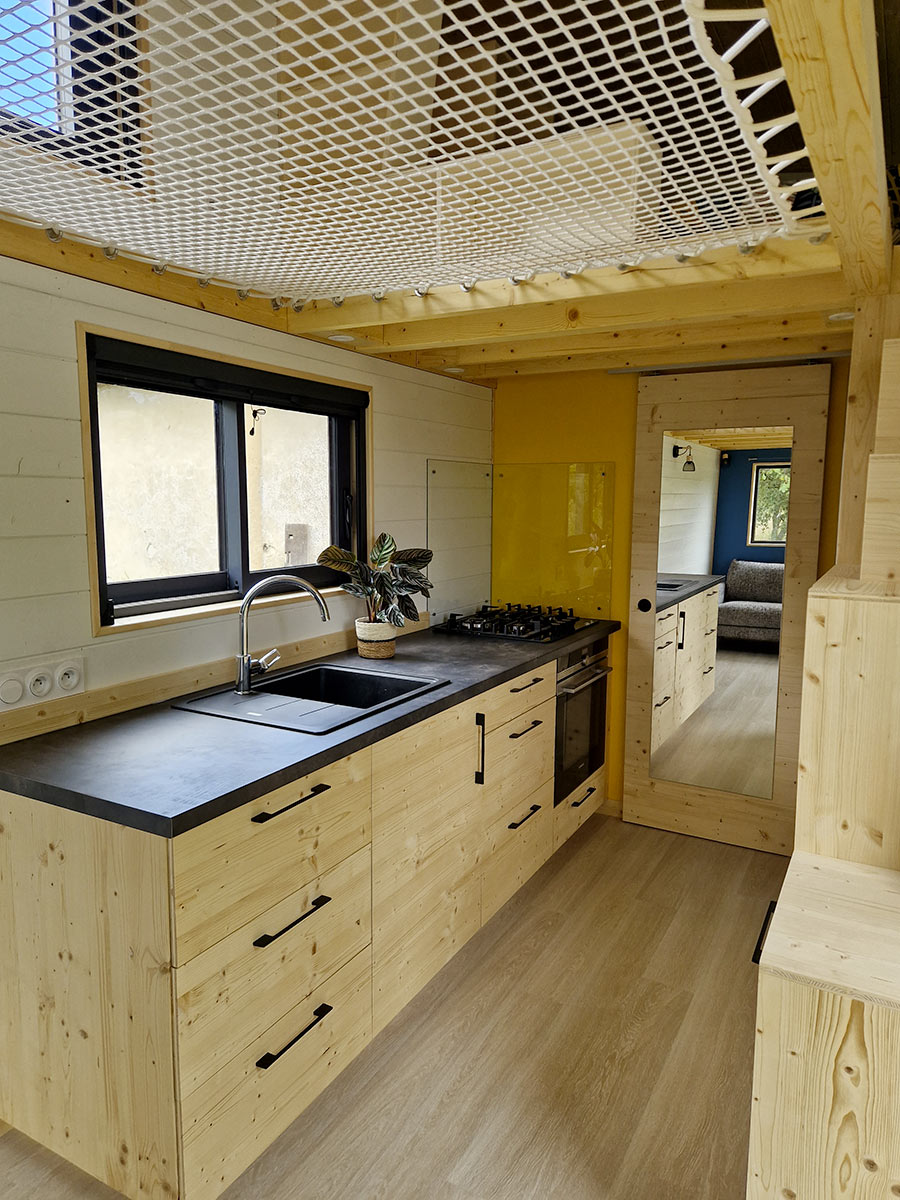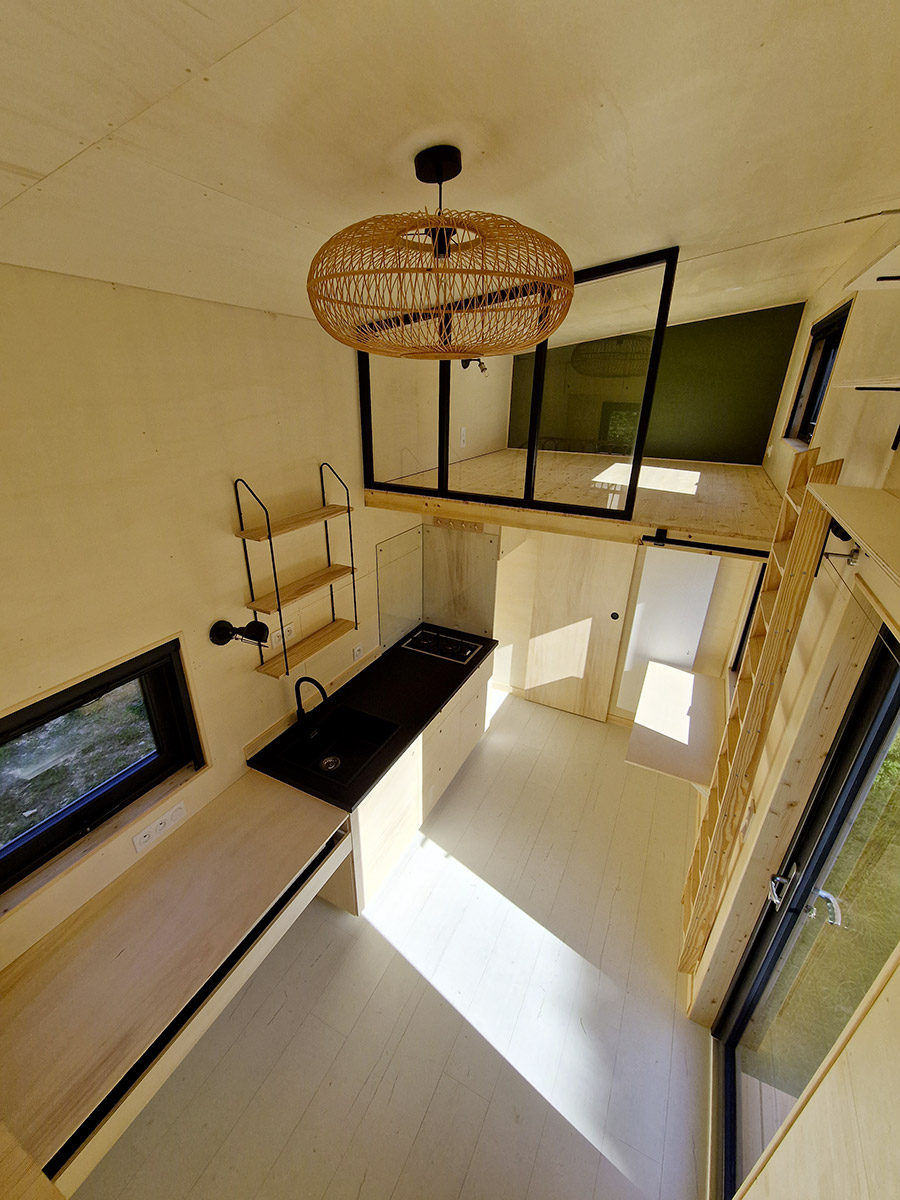 Cette Tiny adopte un style scandinave, grâce à la clarté de ses murs et de son mobilier en sapin. Le noir des fenêtres, du plan de travail et des autres accessoires apporte le contraste nécessaire pour rendre cet espace de vie moderne. Elle a rejoint sa propriétaire au milieu des montagnes du Vercors.