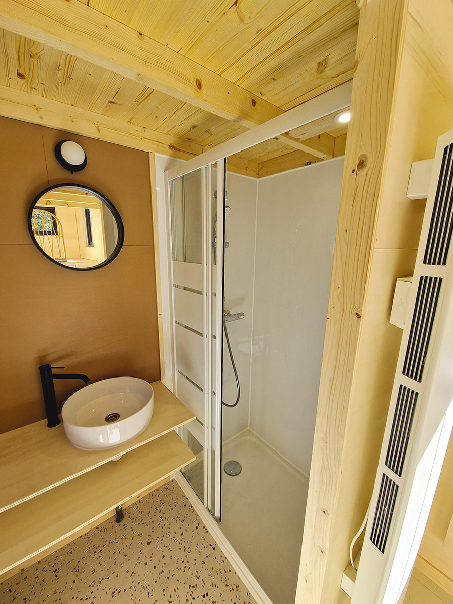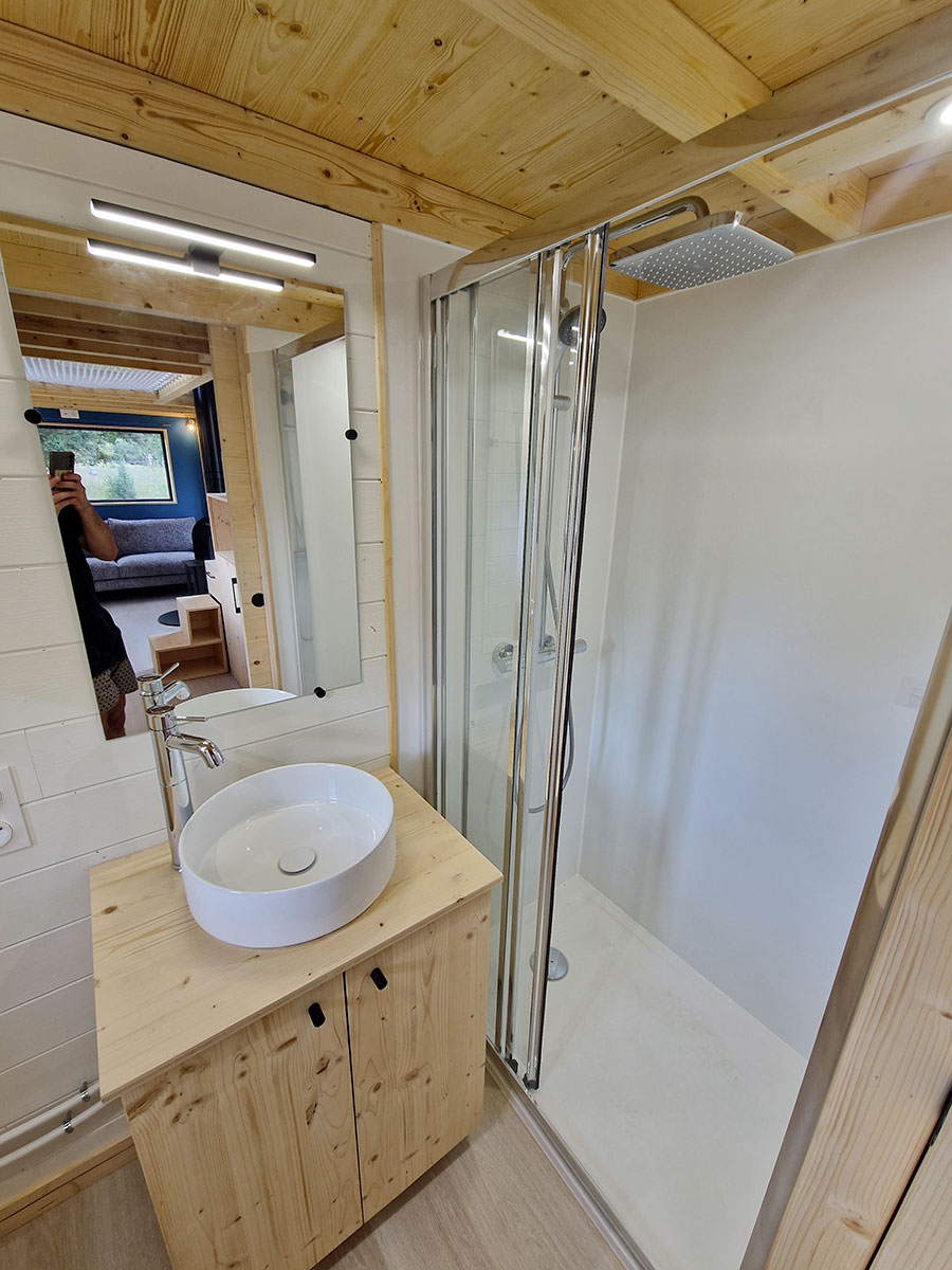 Dans la salle d’eau, Camille peut profiter d’une bonne douche chaude. On y retrouve bien sûr les équipements nécessaires d’une salle de bain classique, dont une vasque et des étagères de rangement, ainsi qu’une toilette sèche.