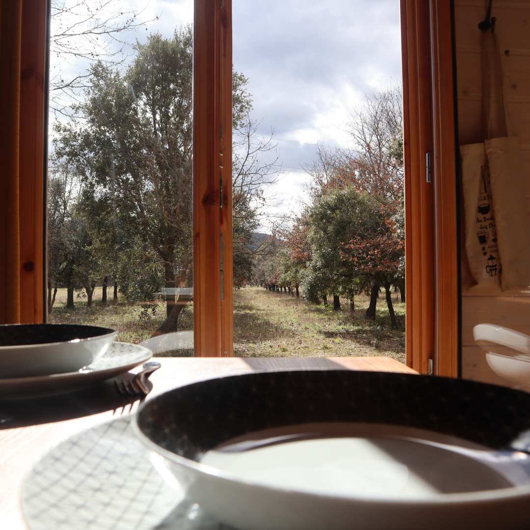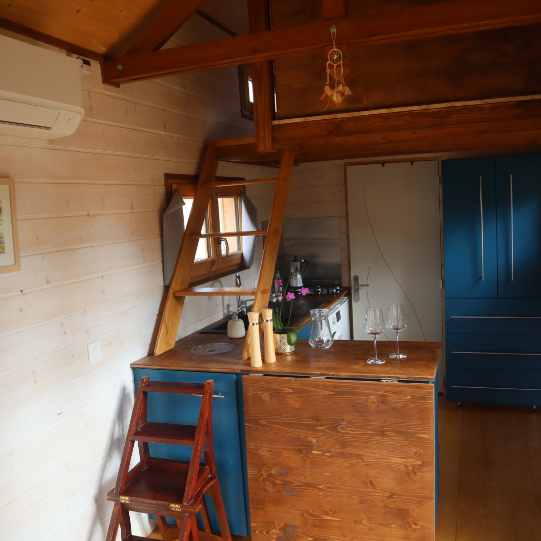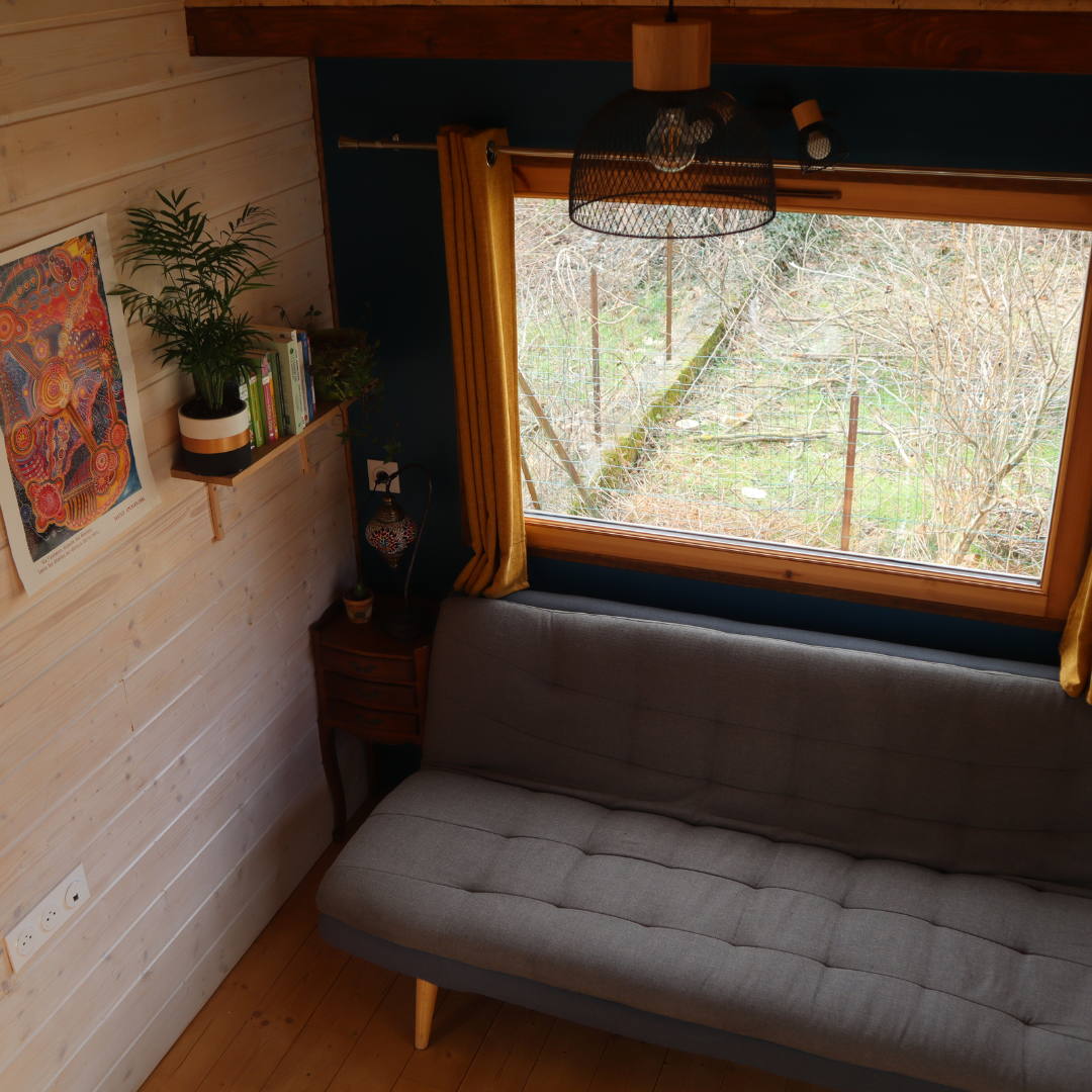 Notre toit à 4 pans révèle tout le charme d’une petite maisonnette au milieu de la nature. Nos fenêtres en bois donnent un aspect authentique et cosy au cœur de la Tiny. Toutes les formes et nuances de bois sont exposées dans cette cabane, dont le parquet massif, le lambris, les meubles en bois. La ferme apparente et les couleurs vives de nos rideaux, murs et cuisines nous immergent dans un univers chaleureusement gai, qui ne passe pas inaperçu à l’œil de nos visiteurs.
