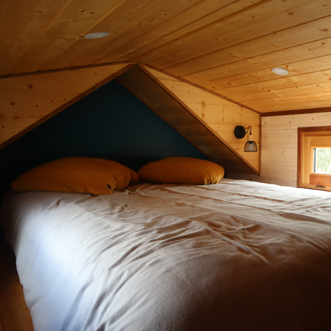 A l’étage, nous pouvons nous assoupir dans notre lit confortable avec cette sensation enfantine de vivre en cabane, tout en pouvant apercevoir de nos petites fenêtres le lever du soleil. Nous avons un grand meuble avec deux tiroirs pour ranger nos vêtements.