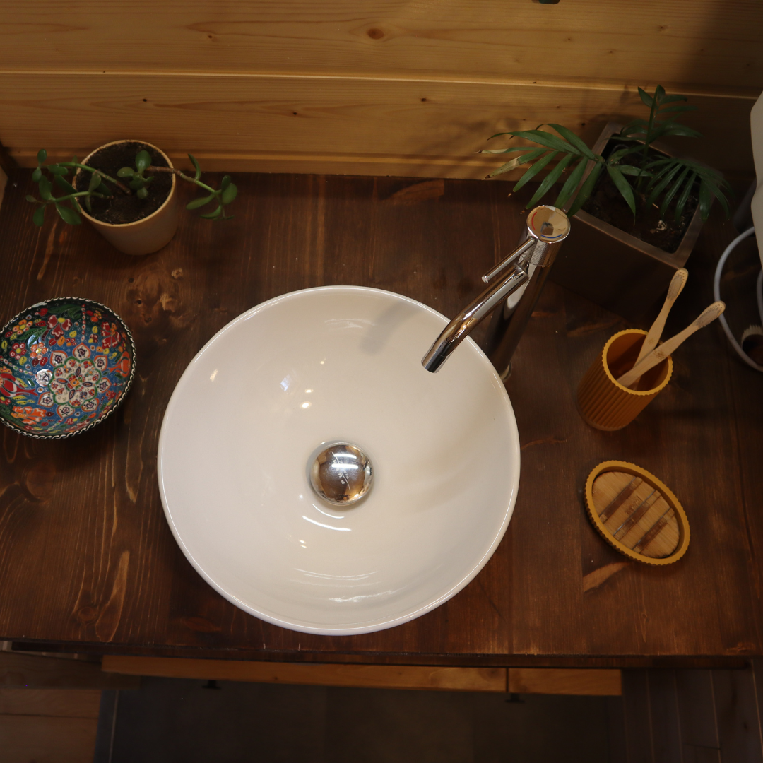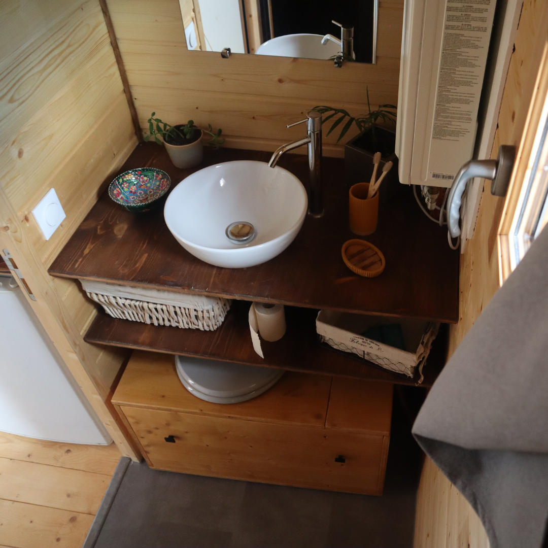Dans la salle de bain, on retrouve une douche de 70 x 100 cm complètement fermée grâce à sa porte coulissante. De l’autre côté une vasque posée sur une large étagère, qui permet d’entourer l’évier de nos produits du quotidien, dont le dentifrice, le savon, brosse à dents et toujours une plante pour décorer la pièce. Une autre étagère est fixée en dessous qui nous donne largement la place pour poser l’ensemble des objets de salle de bain. Un étage en dessous, nous avons notre panière à linge sale et la toilette sèche qui se tire.