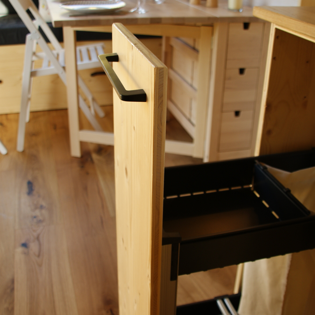 Aménagement : meuble en épicéa, coulisse et charnière blum