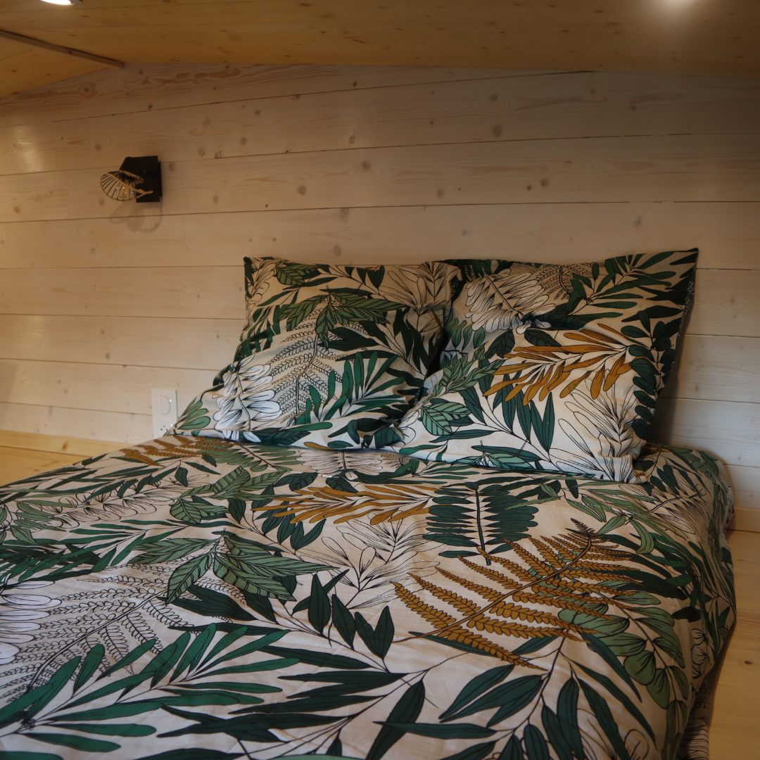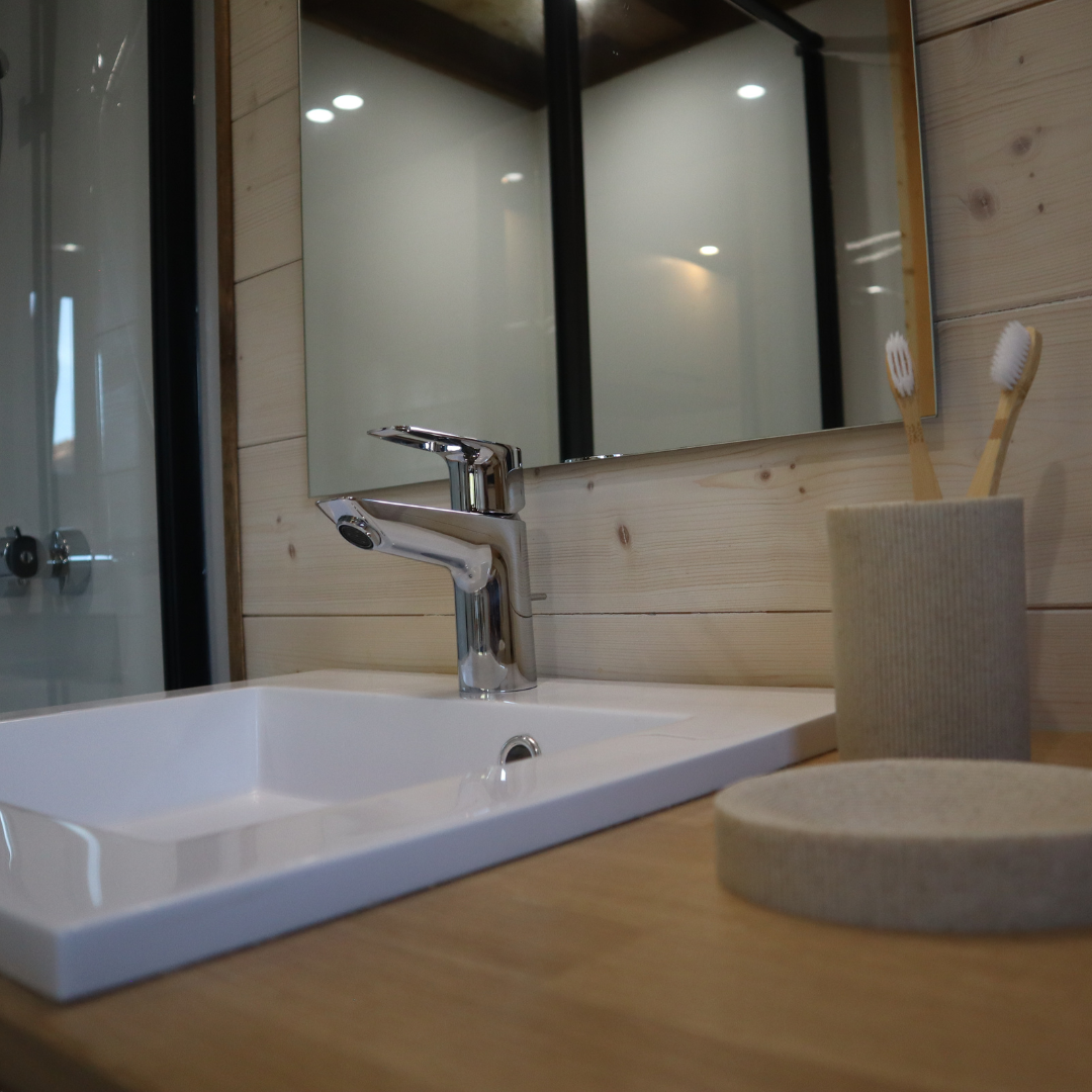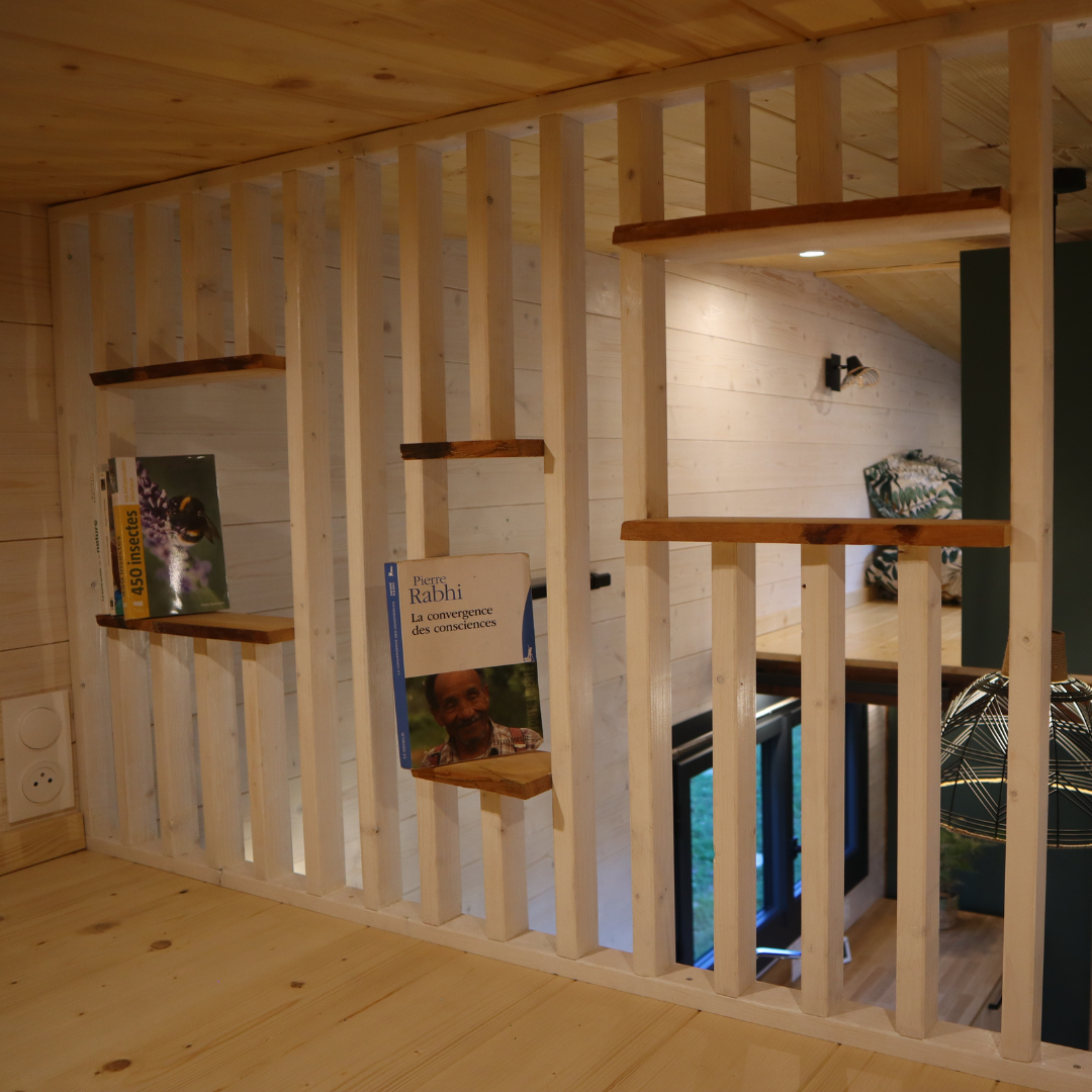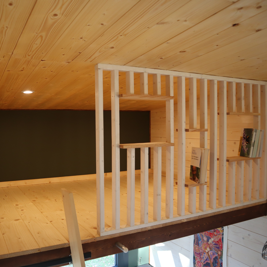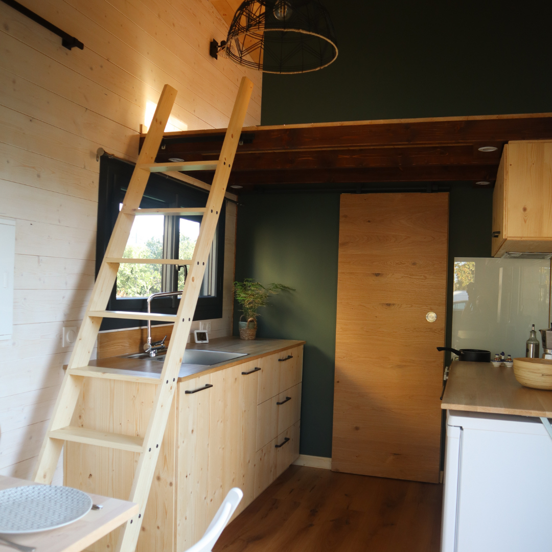 Le parquet contrecollé chêne se laisse nettoyer facilement pour que nos pieds aient le plaisir de parcourir la Tiny sur les veines de bois étincelantes. L’échelle accolée au mur nous donne la possibilité de passer d’une mezzanine à une autre rapidement.