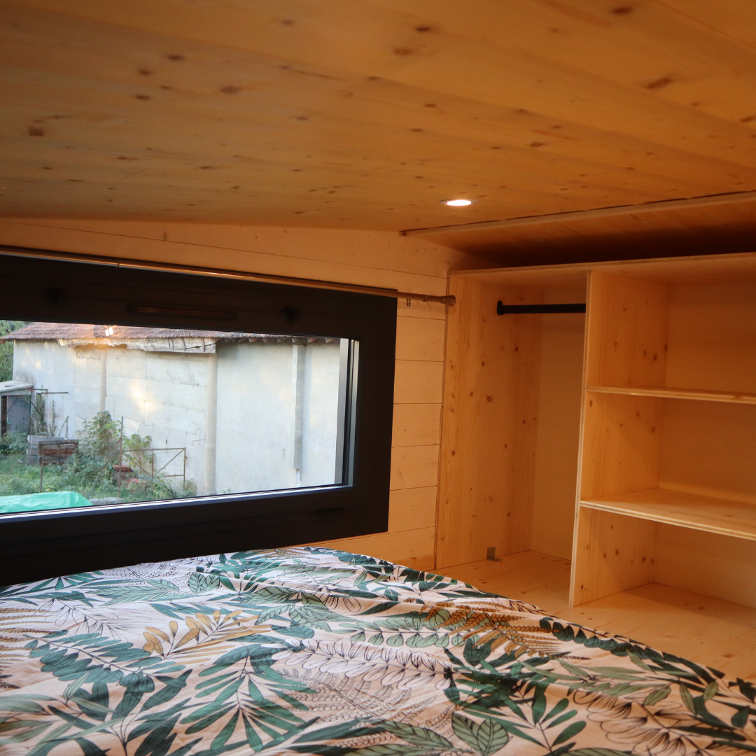 Cette Tiny dispose de deux mezzanines, dont une, équipée d’un meuble de rangement avec penderie. L’autre mezzanine peut servir d’un coin détente, bureau ou une chambre pouvant accueillir un matelas 2 places.