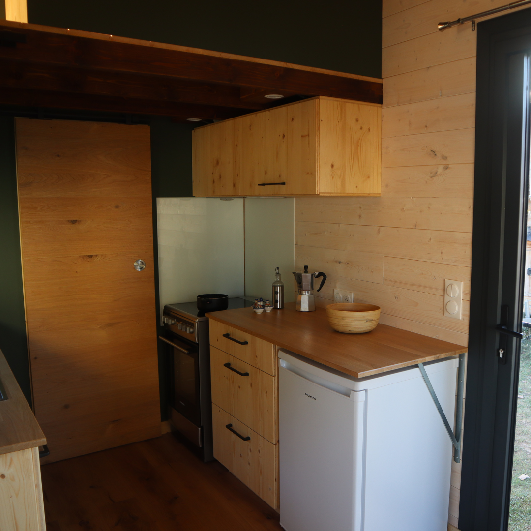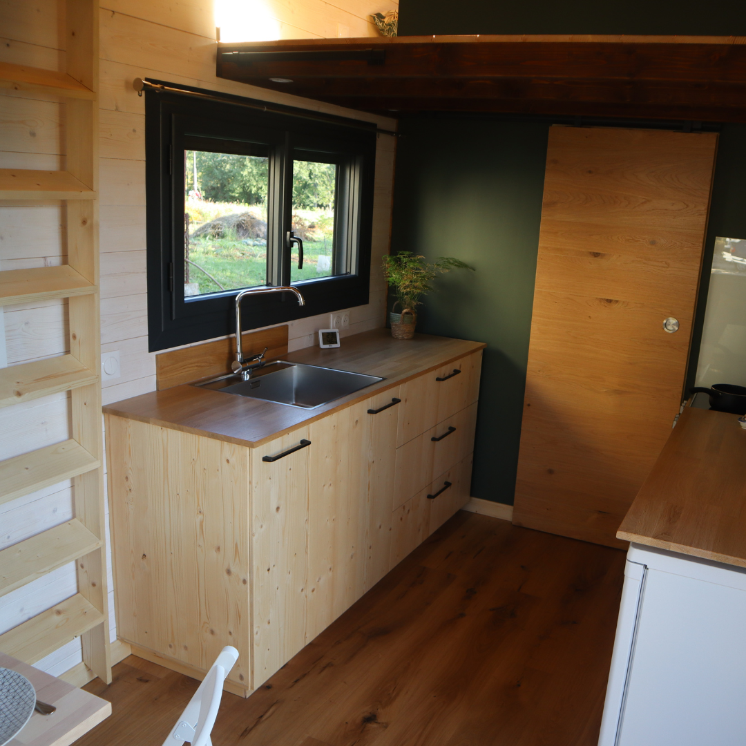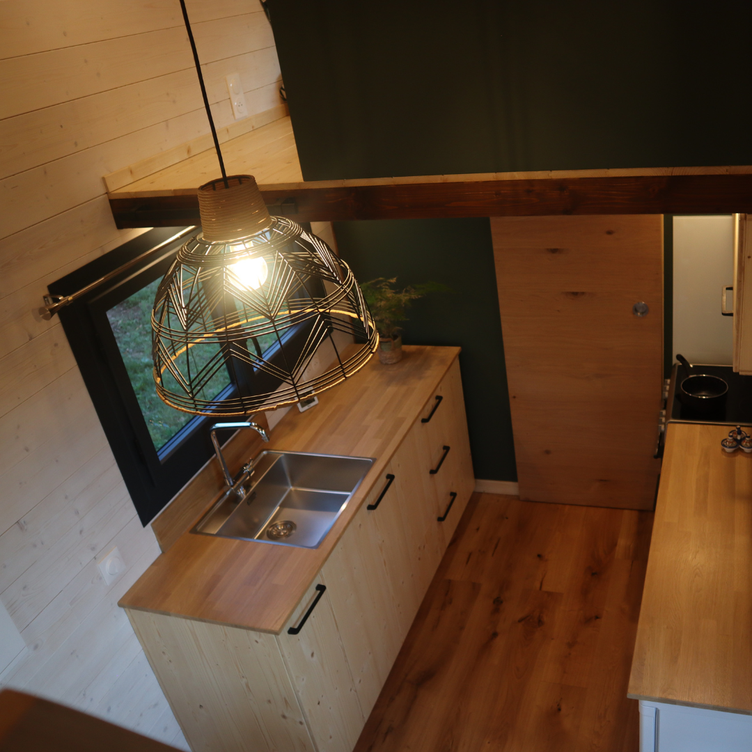 Cette Tiny House est équipée d’une cuisine fonctionnelle et spacieuse grâce à ses multiples meubles. Elle comporte des tiroirs, range pain et épices, placards afin de ranger la vaisselle et les produits alimentaires. Elle est composée d’une hotte aspirante, intégrée dans un placard haut, ainsi que d’un frigo et d’une cuisinière.
