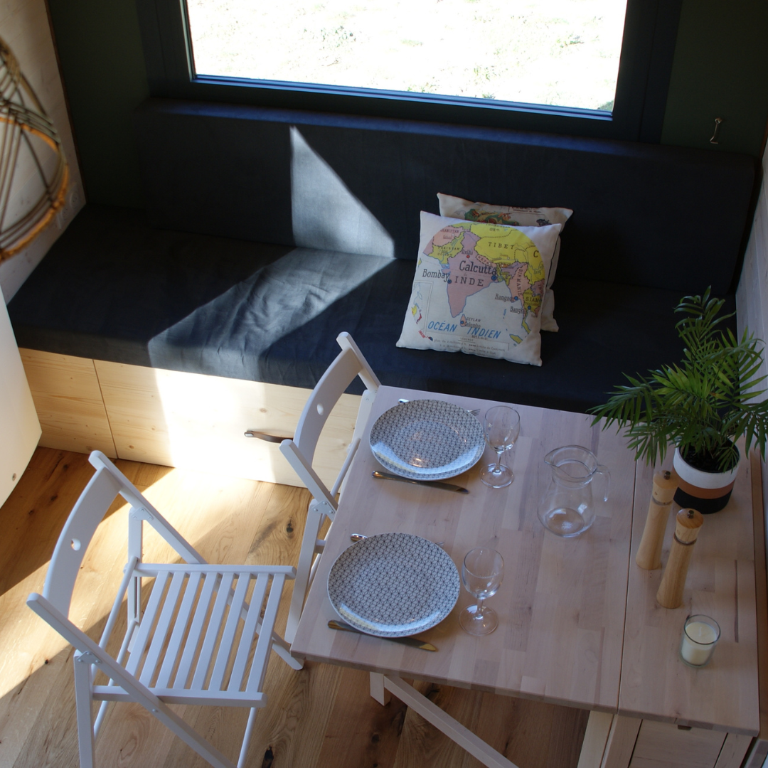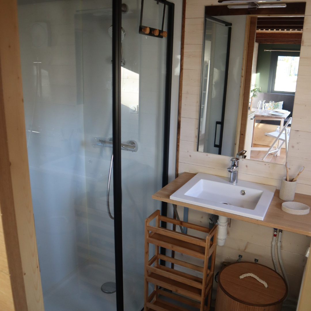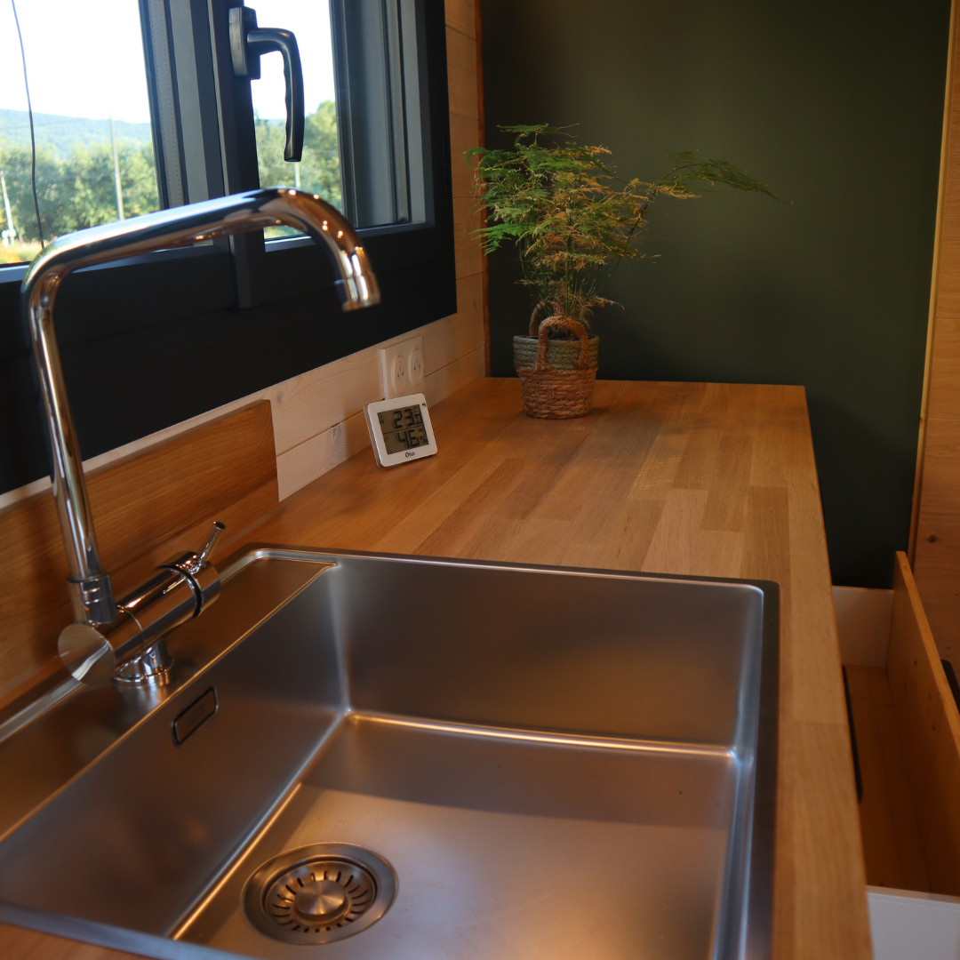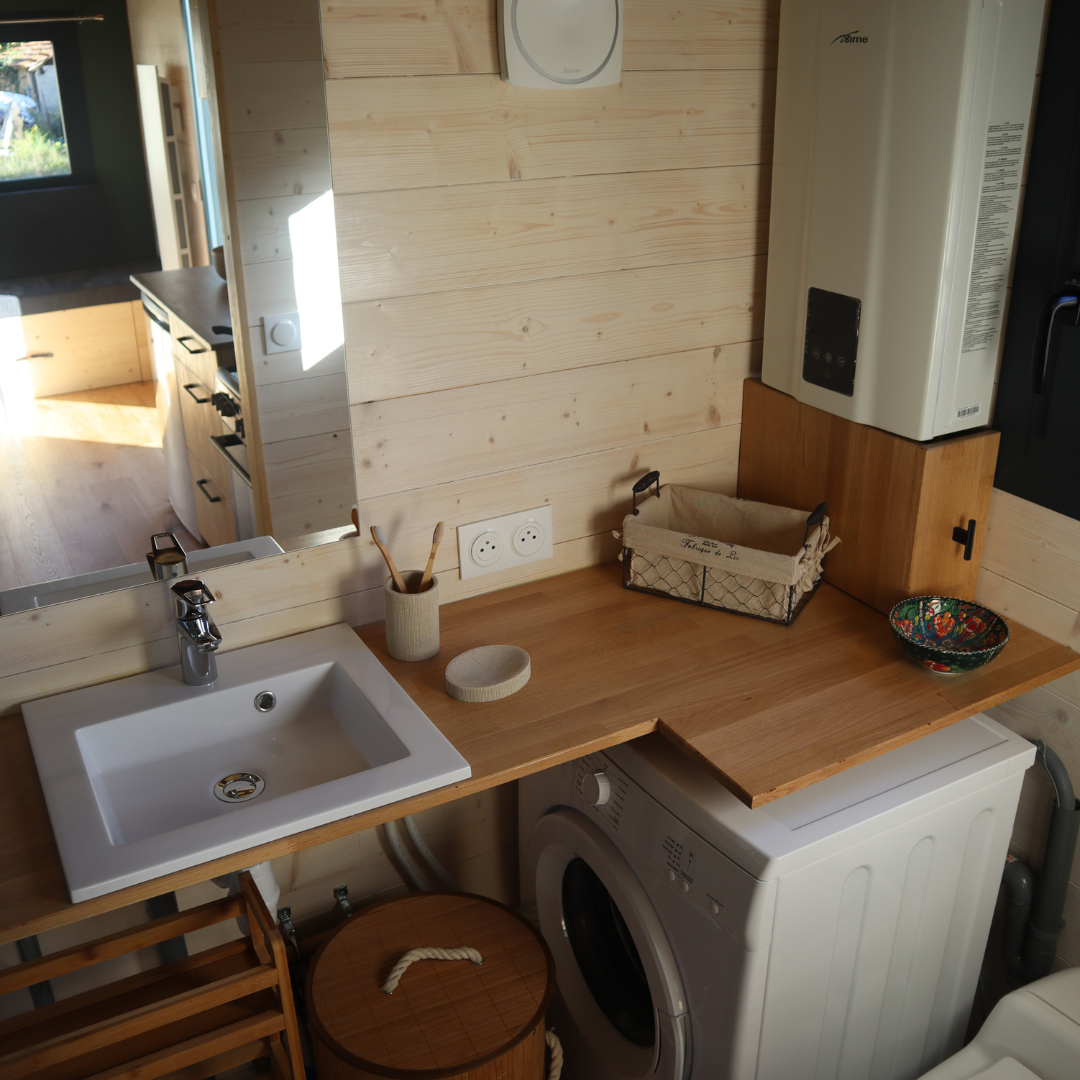Cette Tiny House est équipée d’une cuisine fonctionnelle et spacieuse grâce à ses multiples meubles. Elle comporte des tiroirs, range pain et épices, placards afin de ranger la vaisselle et les produits alimentaires. Elle est composée d’une hotte aspirante, intégrée dans un placard haut, ainsi que d’un frigo et d’une cuisinière.