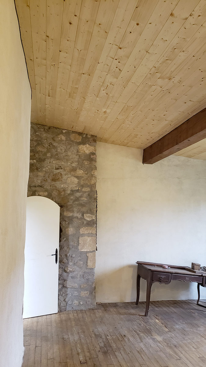 L’architecture ronde et les murs en pierres de cette tour ont représenté un beau défi. Chaque découpe de planche a dû être adaptée sur mesure à son emplacement et à la forme unique de chaque pierre. Ce travail minutieux nous a permis de réaliser des finitions d’une grande précision, fidèles au caractère de la bâtisse.